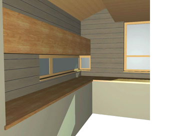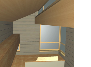 Skissen gjelder et tilbygg i grunnetasjen ved en eksisterende tomannsbolig. Tilbygget er planlagt i massivtre, mens det eksisterende huset er oppført i teglstein. Tilbygget er situert på sydøstsiden; store glassoverflater og horisontal solavskjerming ble foreslått for å utnytte solvarme i boligen. Glass skyvedører gir adkomst til en terrasse som er beskyttet mot vind.