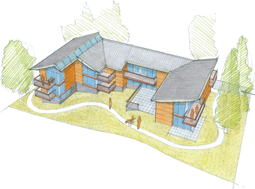 En idéskisse for åtte boenheter med omsorgsservice. Boarealene er orientert mot hagen, mens fellesrommene har utsikt over adkomstarealet.