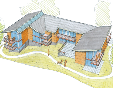 En idéskisse for åtte boenheter med omsorgsservice. Boarealene er orientert mot hagen, mens fellesrommene har utsikt over adkomstarealet.